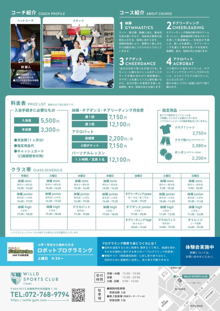 お知らせ NEWS すべて イベント トピックス 2025.02.18 春の入会キャンペーン 無料体験随時行っております。 ご予約は、お電話かHPの問い合わせメールからご連絡ください。 キャンペーン内容は、下記チラシをご覧ください。 2025年 1月度~4月度のレッスンカレンダー 春の短期レッスン