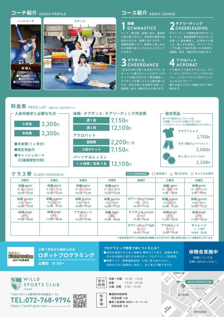 お知らせ NEWS すべて イベント トピックス 2025.09.15 秋の入会キャンペーン 2025 現在、秋の入会キャンペーンを実施中です! お得なキャンペーンとなっておりますので、ぜひこの機会にお待ちしております。 無料体験は随時実施しております。 HPの問い合わせメールかお電話にてご連絡ください。 満3歳児さんの受付も行っております。 アクロバットコース限定のキャンペーンも行っておりますので、チラシをご確認ください! クラスの空き状況も添付しております。 皆様、お待ちしております! 夏の短期レッスン 2026 春の短期レッスン申し込みフォーム